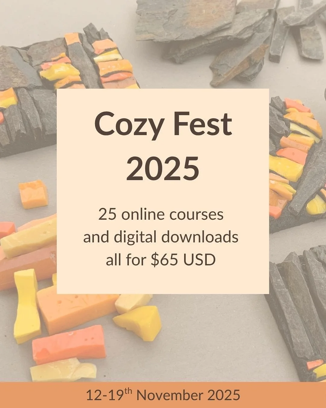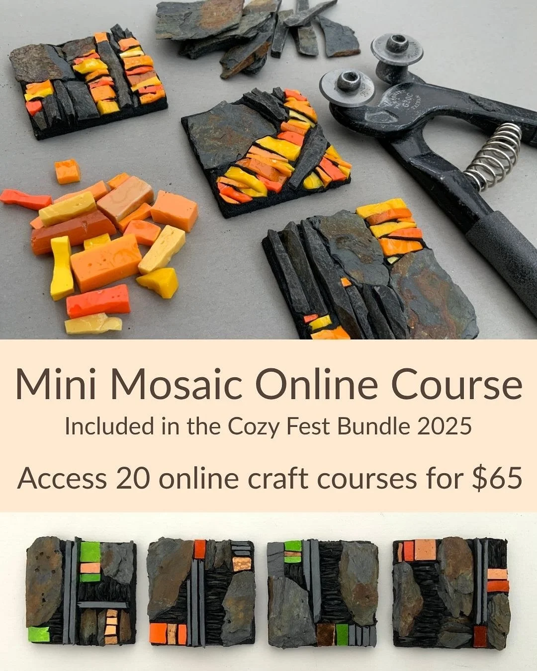 The Cozy Fest Bundle is available for just one week (12-19th November 2025). When you buy the bundle you get lifetime access to my Mini Mosaic online course (worth $60), as well as over 20 online courses in other disciplines, including weaving, embroidery, quilting, wreath-making, dyeing, drawing and more.