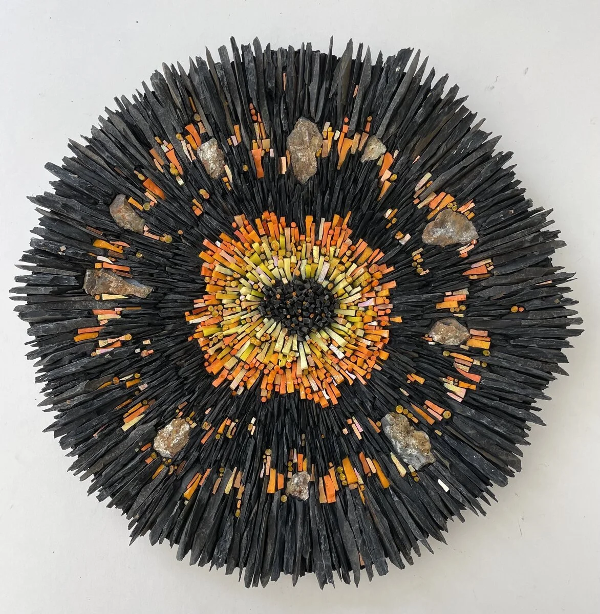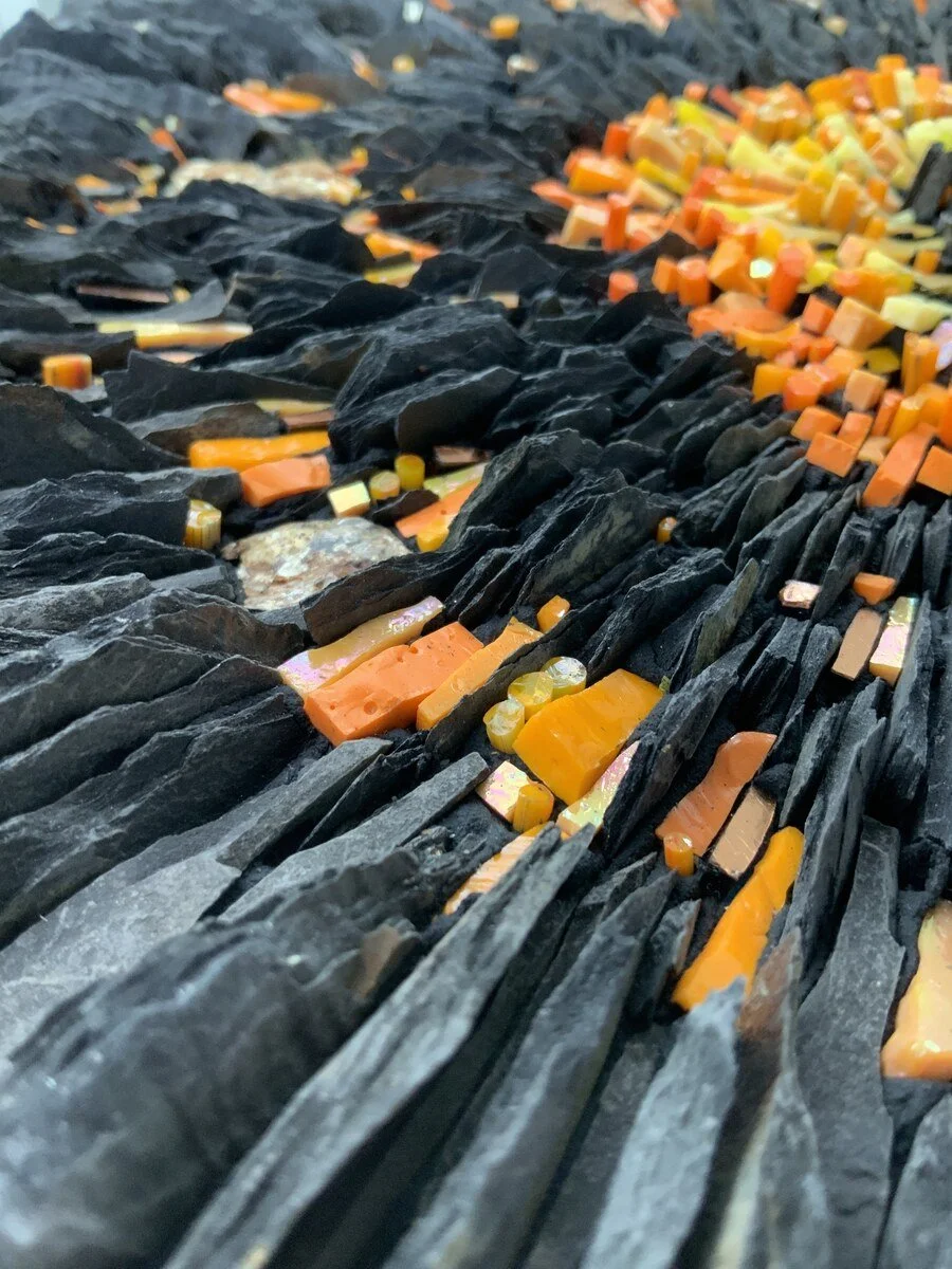 Materials: Slate, shale, smalti, stone, hand-made filati.