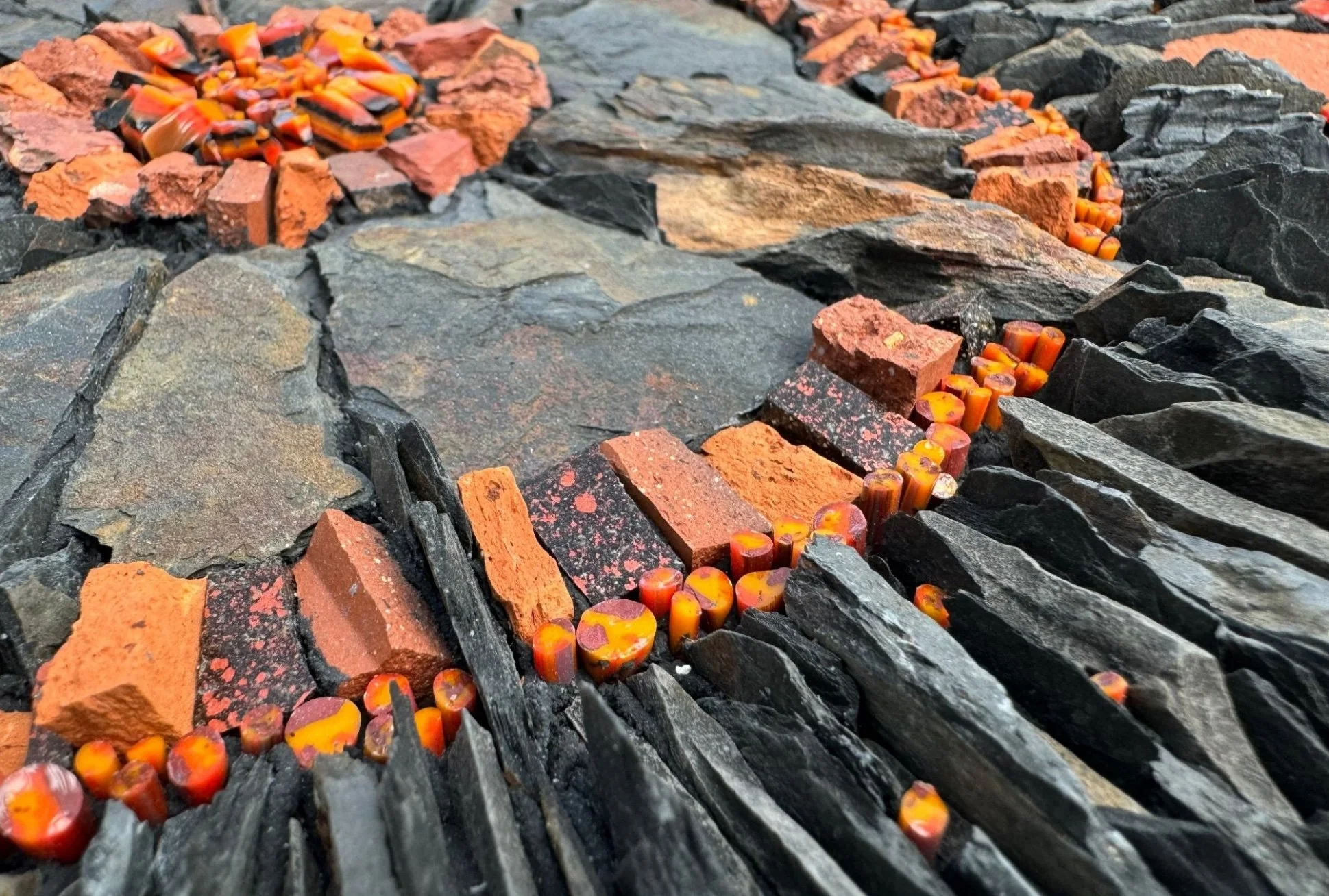 This mosaic was inspired by how tree rings can tell stories. In this case the rings tell the story of my experience of having Covid, using oranges to represent energy and blacks/greys to represent fatigue.